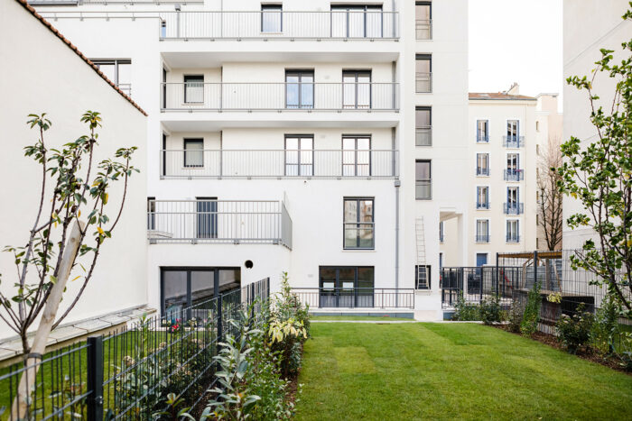 Résidence R+5+A composée de logements duplex en rez-de-chaussée et aux derniers niveaux ainsi que d’un local d’activité à rez-de-chaussée. Les duplex en rez-de-chaussée constituent de véritables maisons de ville et favorisent une animation du socle de la résidence. Mode constructif traditionnel, béton. Le socle double hauteur du bâtiment est revêtu de pierre.