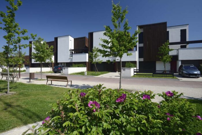 1ère opération privée à ossature bois en France, ce projet de 46 maisons RDC à R+2 d’architecture contemporaine au sein de la ZAC Croix Bonnet a été le projet pilote pour la certification CERQUAL des opérations à ossature bois, certification obtenue en 2008.